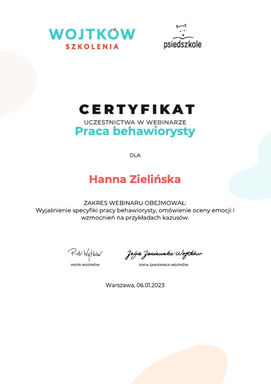 Cześć! Mam na imię Hania i jestem licencjonowaną behawiorystką oraz trenerką psów, absolwentką Polskiej Szkoły Animaloterapii i Zoopsychologii w Krakowie.